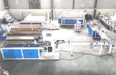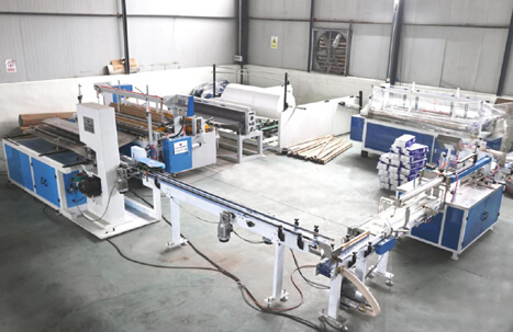 The complete toilet tissue paper roll production line mainly includes three parts: jumbo roll toilet tissue paper rewinding machine, cutting machine and packing machine.